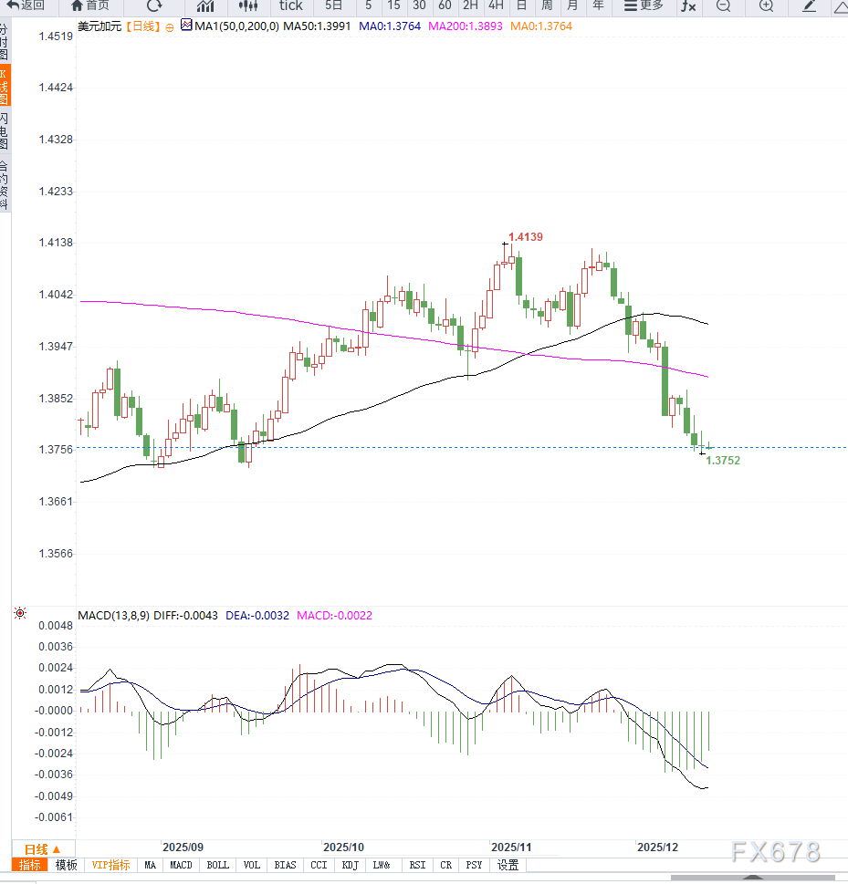 此外,加拿大将于周一发布11月消费者价格指数(CPI),预计同比升幅从10月的2.2%增至2.4%,可能进一步支撑加元。总体来看,美元/加元短线承压于低位,市场情绪偏谨慎。
